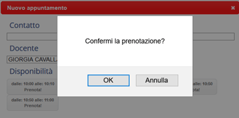 Una volta selezionato l'orario di prenotazione, il sistema chiederà conferma di tale prenotazione, e solo dopo aver effettuato click su "Ok" la prenotazione sarà andata a buon fine.