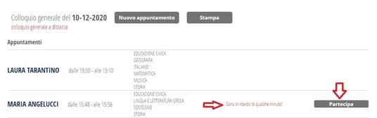 3. verificati i punti precedenti, il tasto "partecipa" sarà visibile SOLO nel giorno di prenotazione, dopo che il docente avrà avviato il colloquio; inoltre, sarà visibile fino a quando non sarà trascorsa la data dell'evento, oppure fino al momento in cui il docente avrà indicato lo stato del colloquio (genitore "ricevuto" o "non ricevuto").