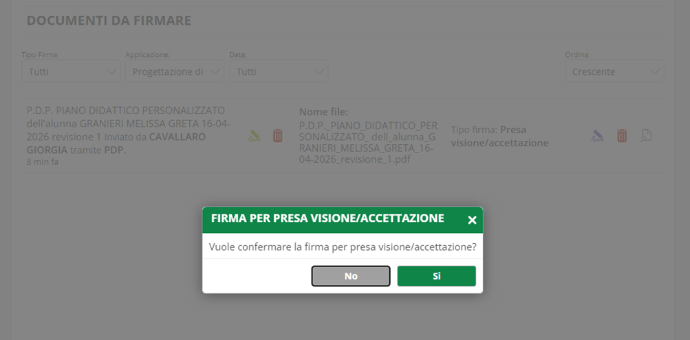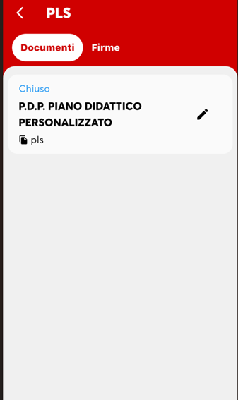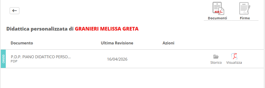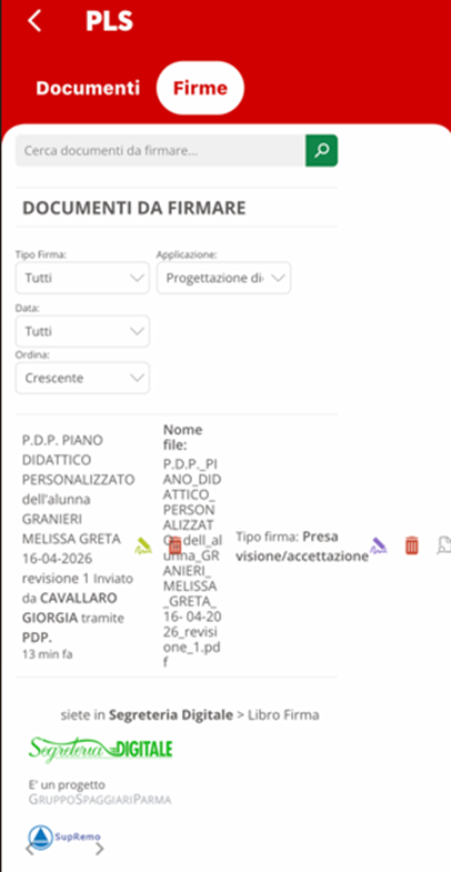In DOCUMENTI è possibile aprire e visualizzare i documenti (PDP, PEI, ecc.); in FIRME è possibile procedere con la firma e inviarla alla scuola.