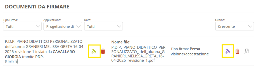 Anche in app, la sezione FIRME mostra il/i documento/i da firmare con l'icona della matita: verde per la firma massiva, viola per la firma singola.